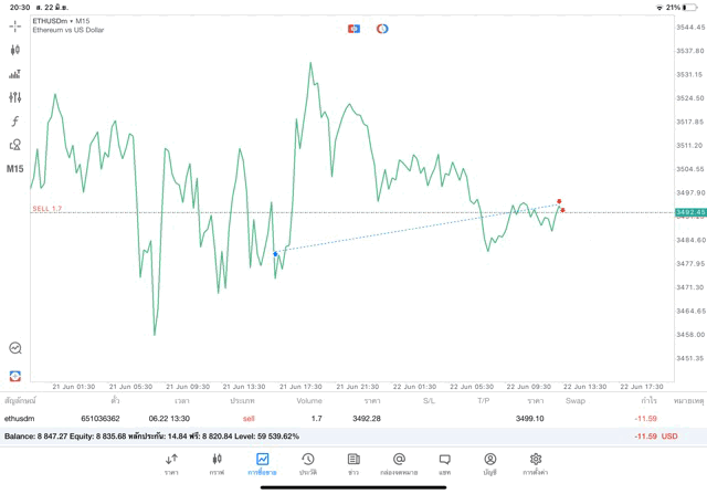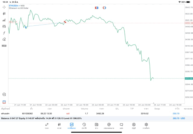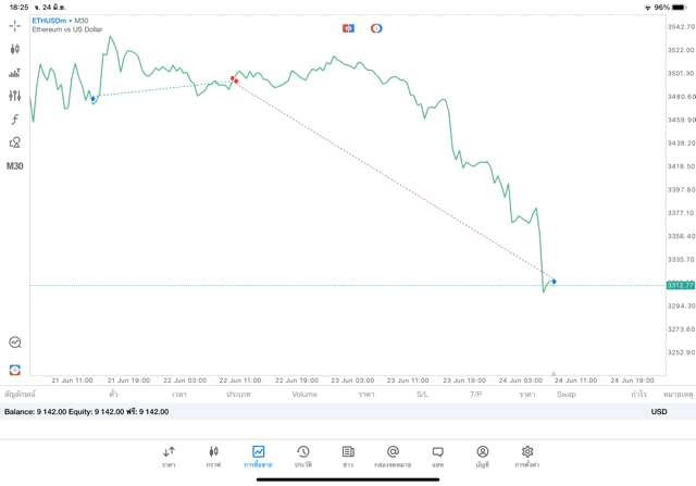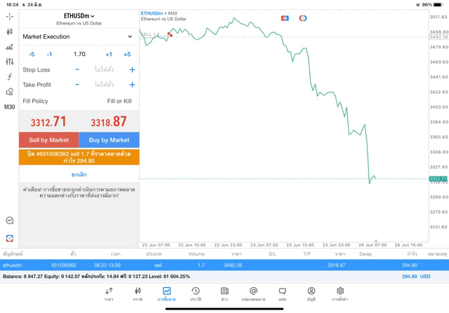 คลิ๊กปุ่ม Sell จะได้กำไรเมื่อราคา ETHUSD ลง การ Sell จะขาดทุนเมื่อราคา ETHUSD ขึ้น