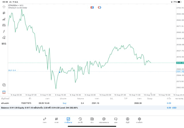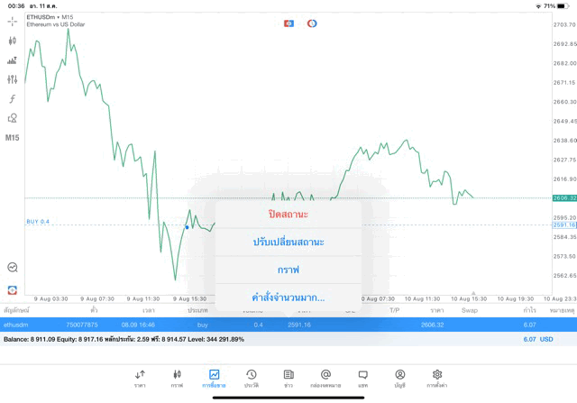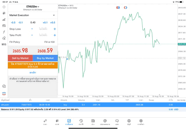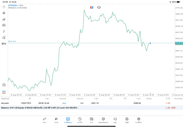 การเทรด Crypto ETHUSD 0.4 lot บน แอพเล่นหุ้น mt5