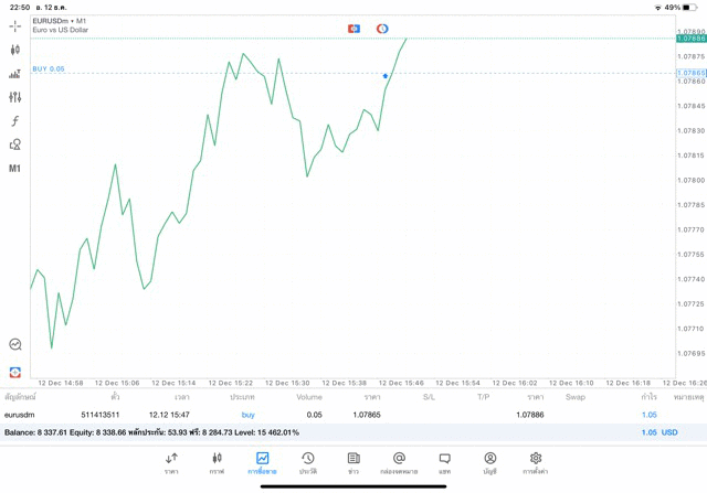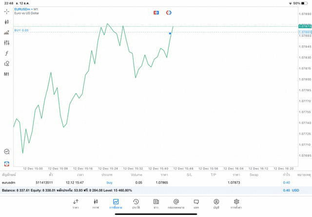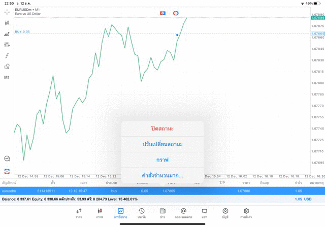 การเทรด forex EURUSD 0.05 lot บนแอพ mt5
