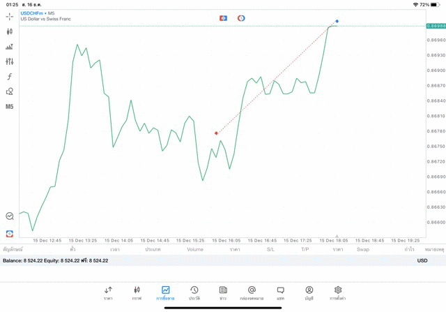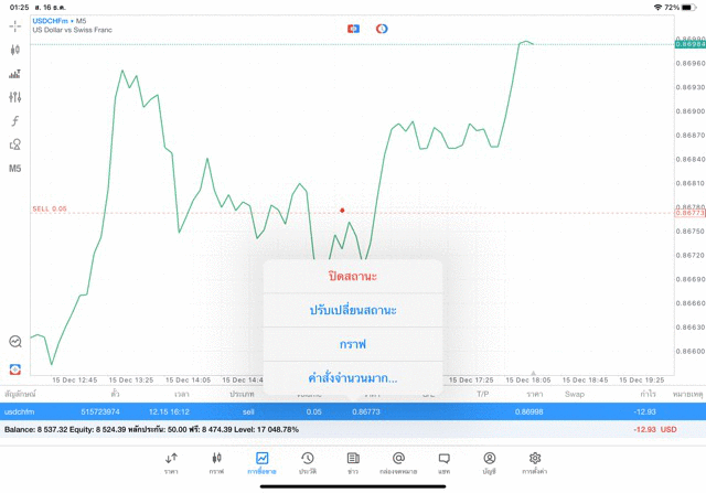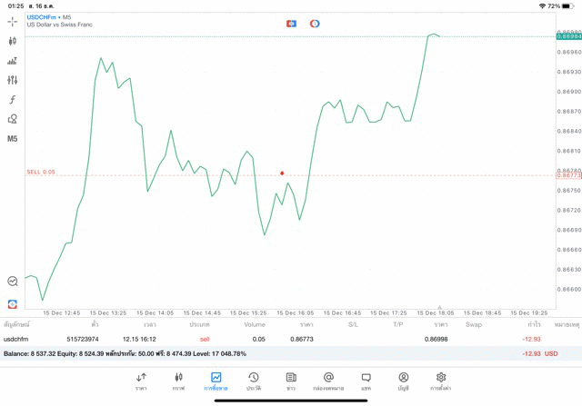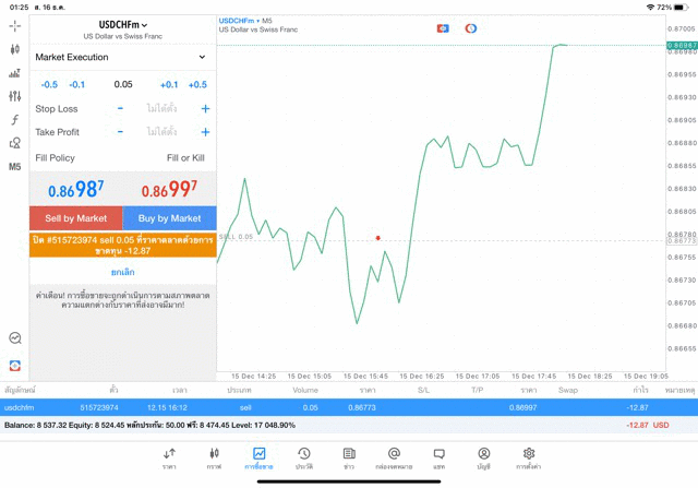 การเทรด forex USDCHF 0.05 lot บนแอพเล่นหุ้น mt5