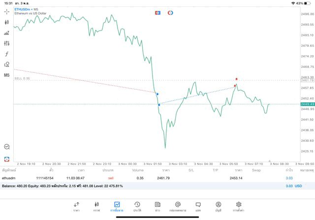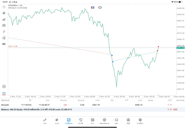 การเทรด Crypto ETHUSD 0.35 lot บน แอพเล่นหุ้น mt5