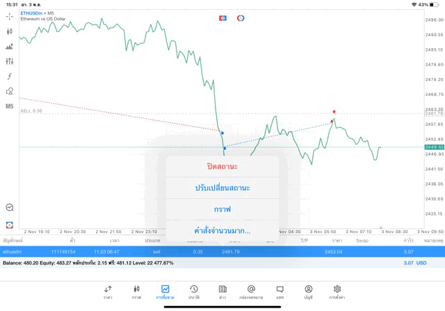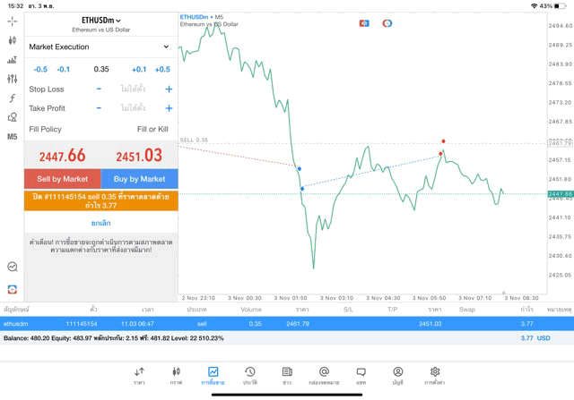 คลิ๊กปุ่ม Sell จะได้กำไรเมื่อราคา ETHUSD ลง การ Sell จะขาดทุนเมื่อราคา ETHUSD ขึ้น