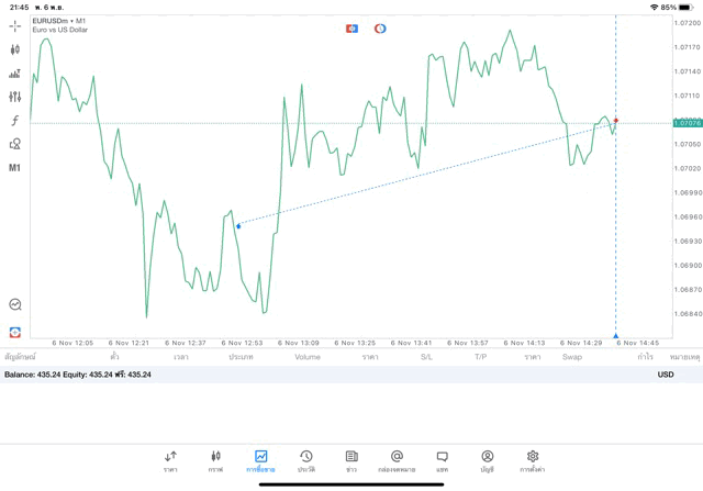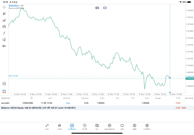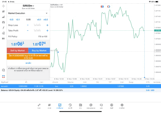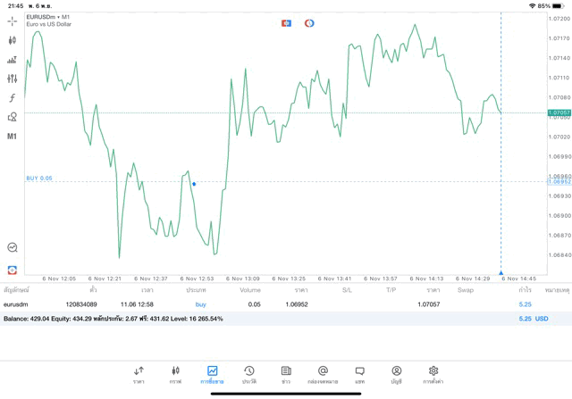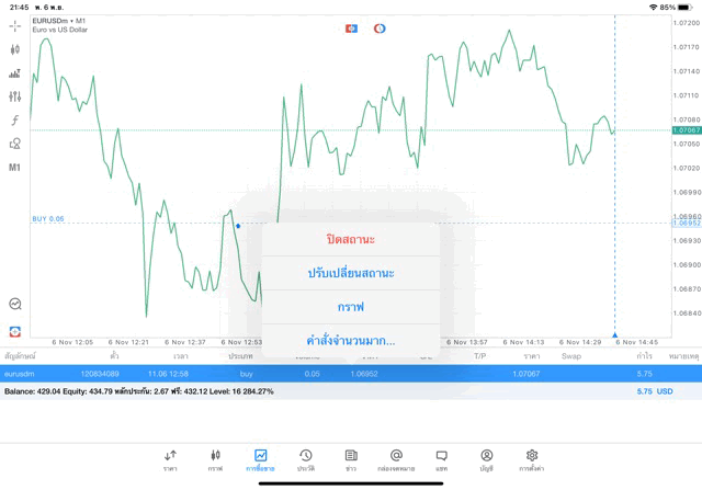 การเทรด Forex EURUSD 0.05 lot แอพ mt5