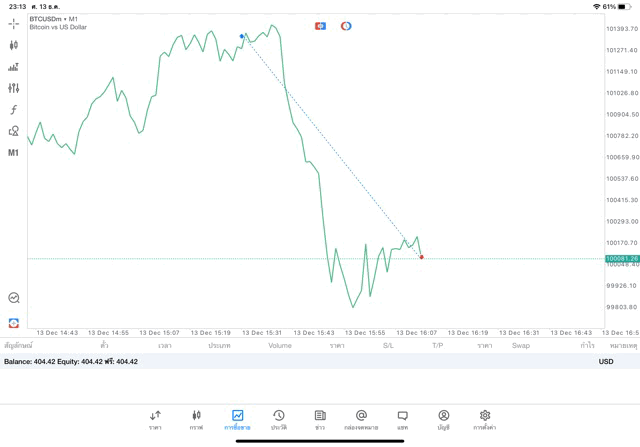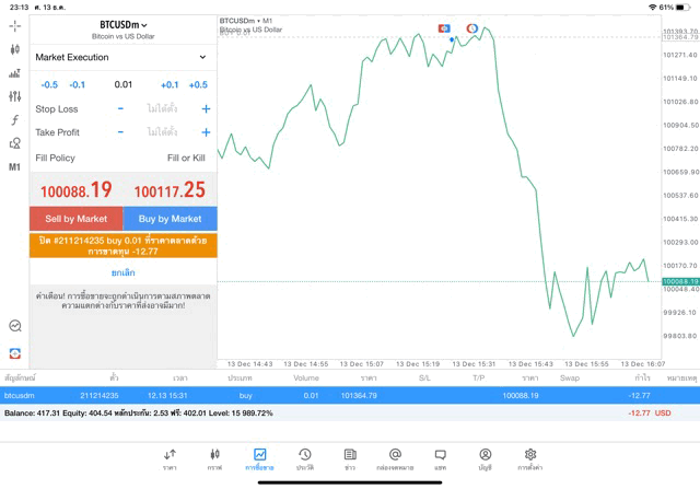 เริ่มแล้ว ติดลบก่อนนะ การเทรด Crypto BTCUSD บนแอพเล่นหุ้น mt5 exness เมื่อราคามีการเปลี่ยนแปลงจะส่งผลต่อกำไรหรือขาดทุนขึ้นกับการเทรดครั้งนี้