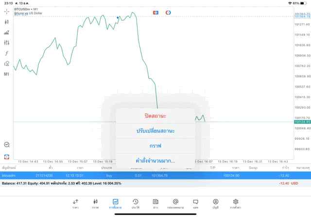 การเทรด Crypto BTCUSD 0.01 lot บน แอพเล่นหุ้น mt5