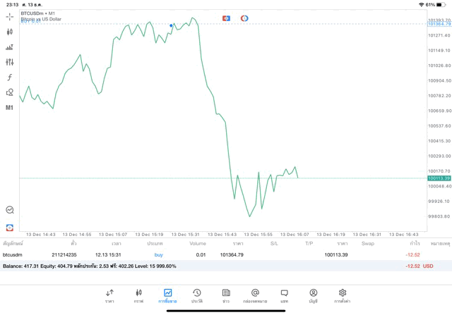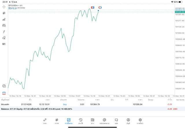 การเทรด Crypto BTCUSD 0.01 lot แอพ mt5