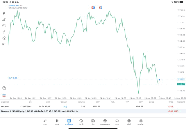 การเทรด Crypto ETHUSD 0.35 lot บน แอพเล่นหุ้น MT5
