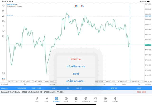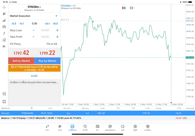 คลิ๊กปุ่ม Buy จะได้กำไรเมื่อราคา ETHUSD ขึ้น การ Buy จะขาดทุนเมื่อราคา ETHUSD ลง