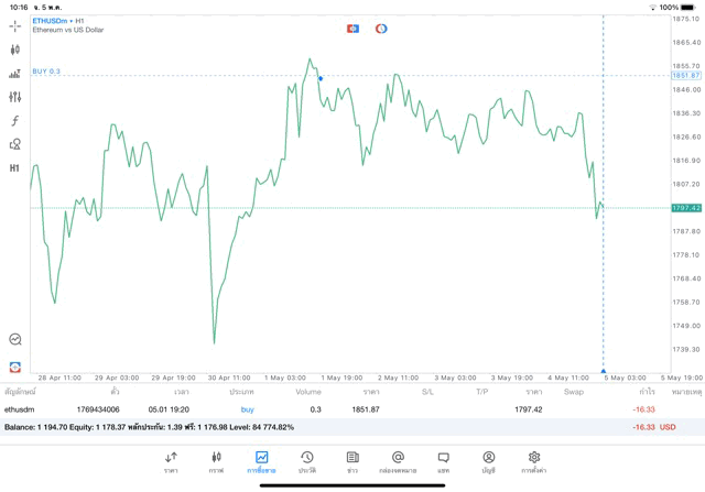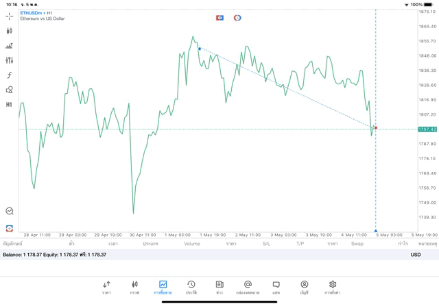 เริ่มแล้ว ติดลบก่อนนะ การเทรด Crypto ETHUSD บนแอพเล่นหุ้น MT5 exness เมื่อราคามีการเปลี่ยนแปลงจะส่งผลต่อกำไรหรือขาดทุนขึ้นกับการเทรดครั้งนี้