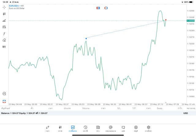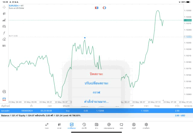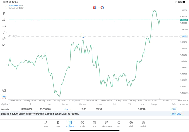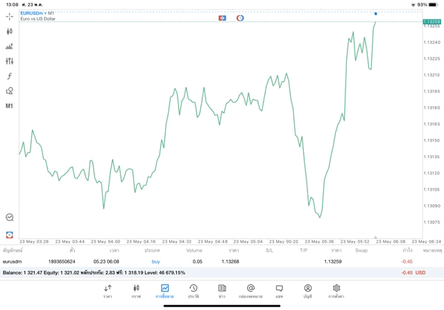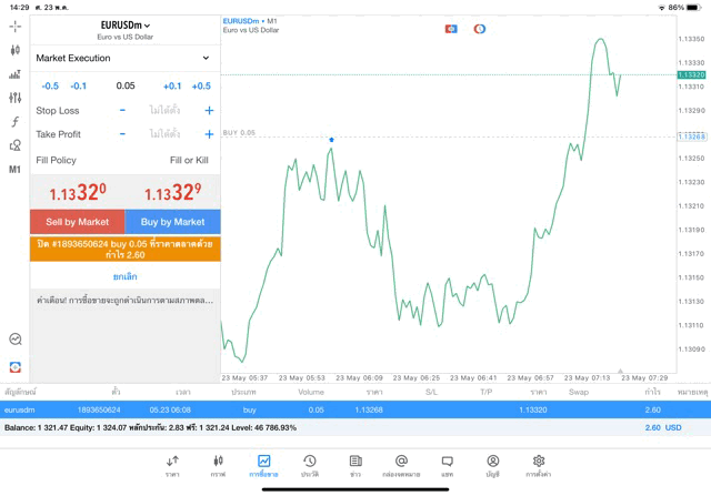 การเทรด Forex EURUSD 0.05 lot แอพ MT5