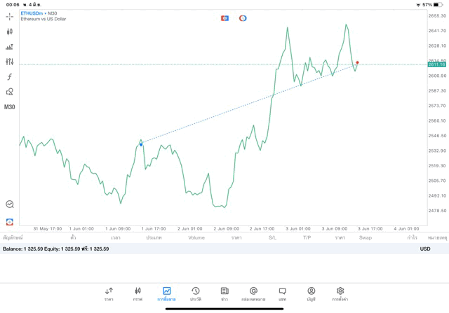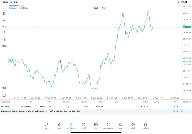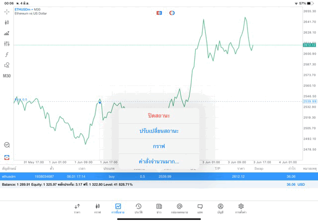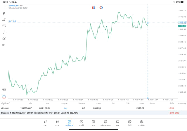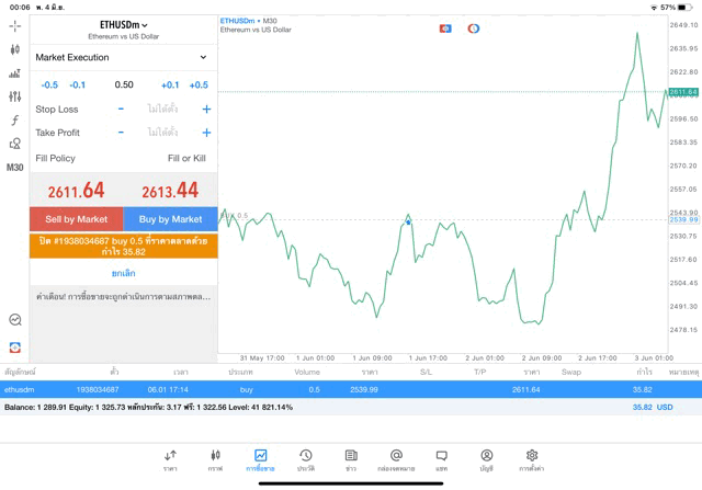 การเทรด Crypto ETHUSD 0.5 lot บน แอพเล่นหุ้น mt5