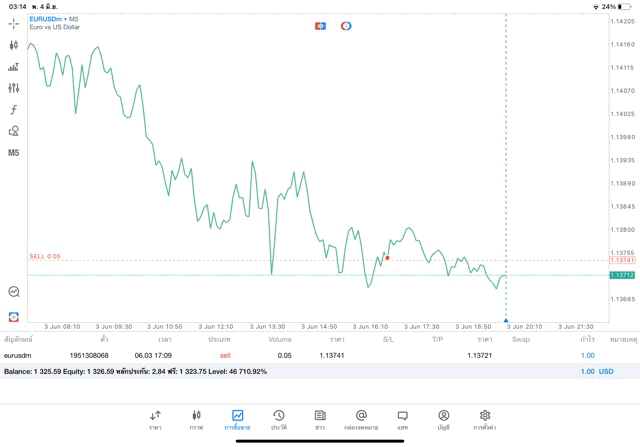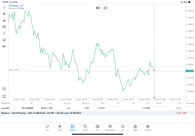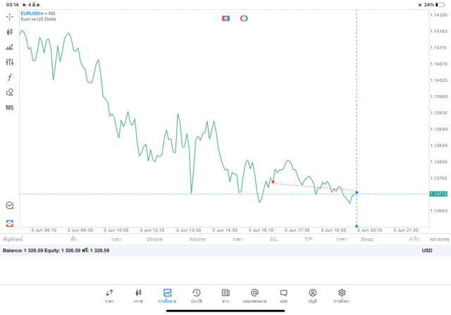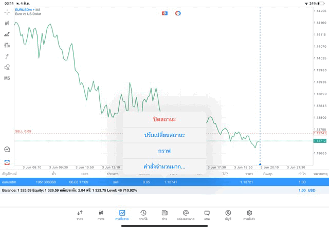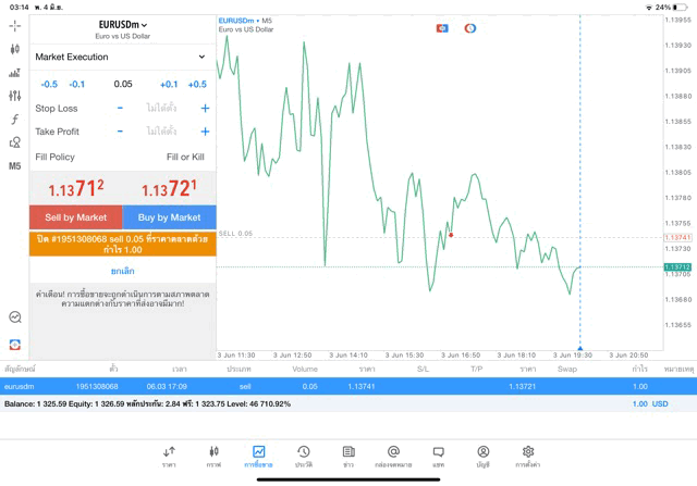 การเทรด Forex EURUSD 0.05 lot แอพ MT5