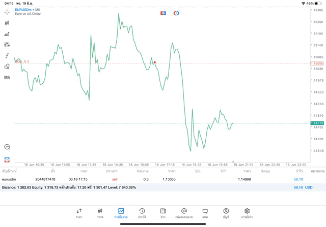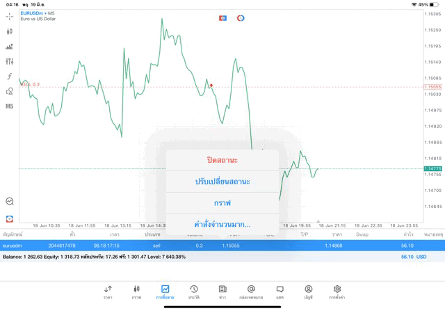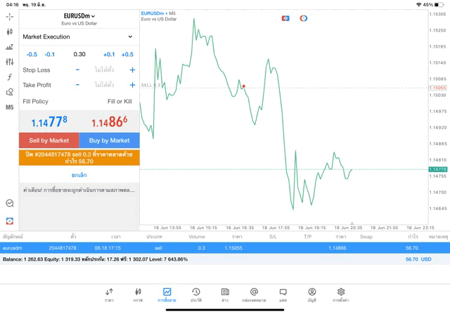 การเทรด Forex EURUSD 0.3 lot แอพ MT5
