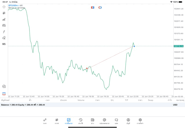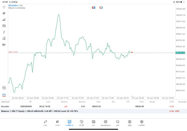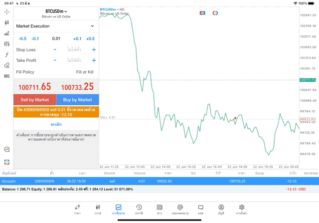 การเทรด Crypto BTCUSD 0.01 lot บน แอพเล่นหุ้น MT5