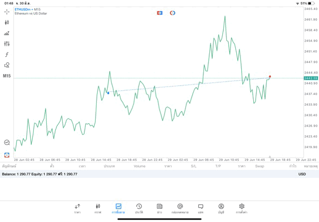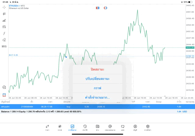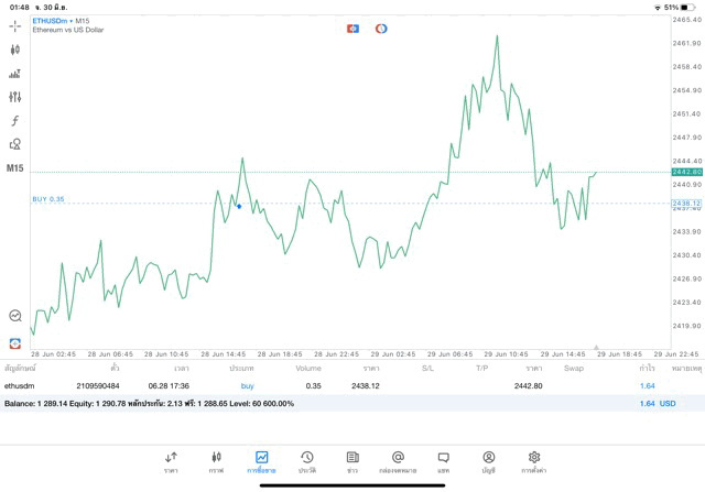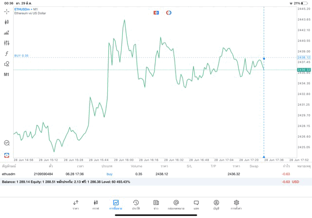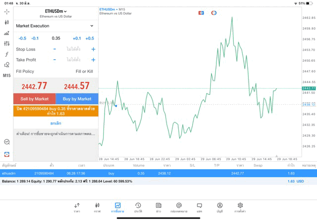 การเทรด Crypto ETHUSD 0.35 lot บน แอพเล่นหุ้น mt5