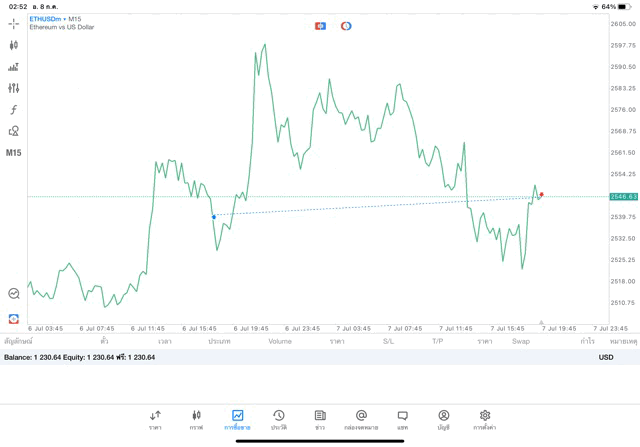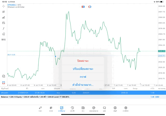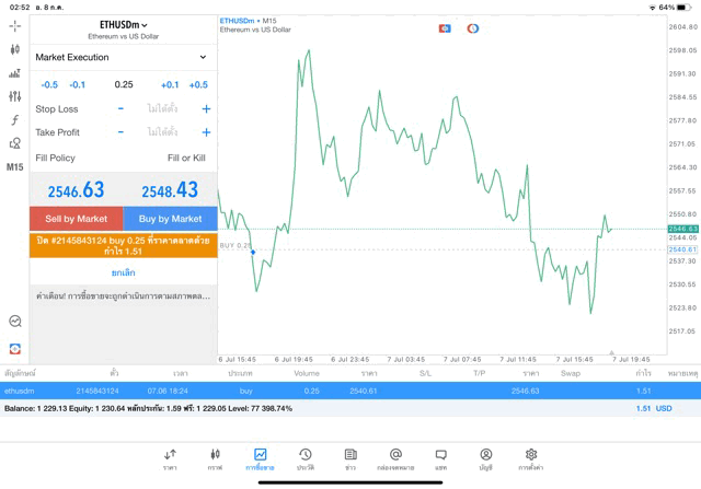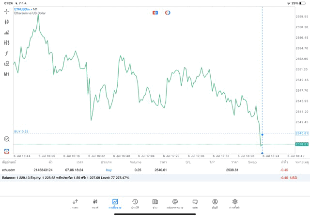 การเทรด Crypto ETHUSD 0.25 lot บน แอพเล่นหุ้น mt5