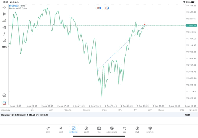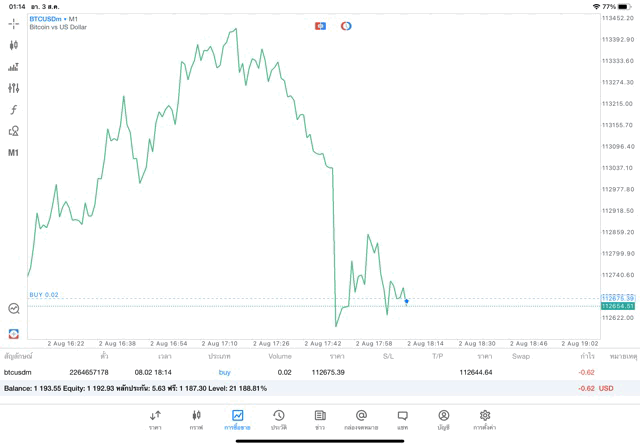 เริ่มแล้ว ติดลบก่อนนะ การเทรด Crypto BTCUSD บนแอพเล่นหุ้น MT5 exness เมื่อราคามีการเปลี่ยนแปลงจะส่งผลต่อกำไรหรือขาดทุนขึ้นกับการเทรดครั้งนี้