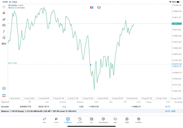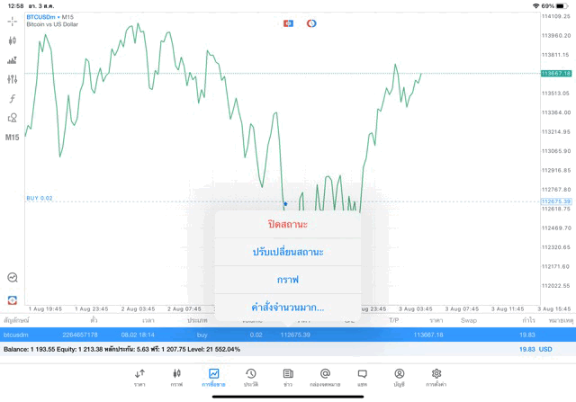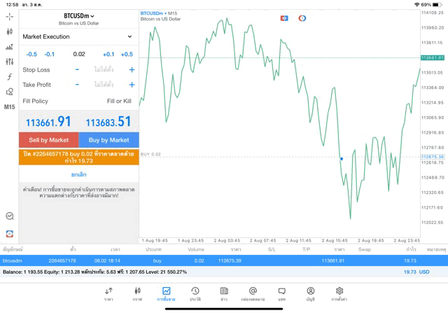 การเทรด Crypto BTCUSD 0.02 lot บน แอพเล่นหุ้น MT5