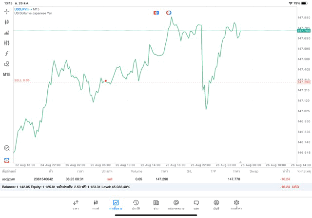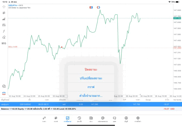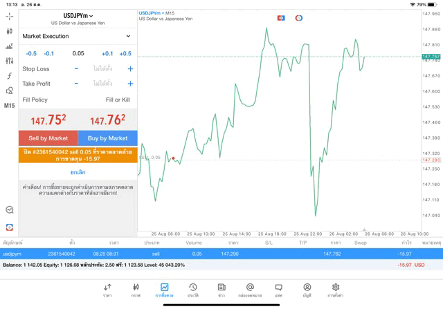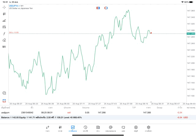 การเทรด Forex USDJPY 0.05 lot แอพ mt5