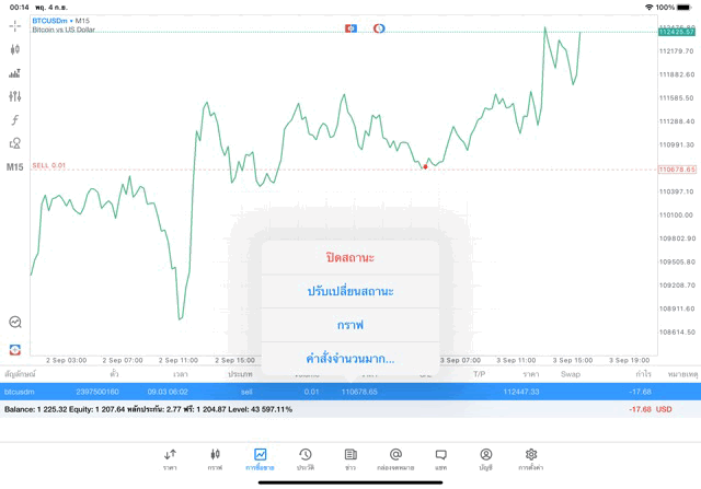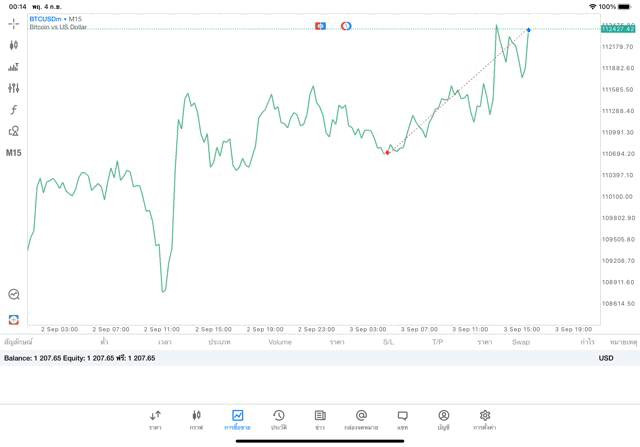 เริ่มแล้ว ติดลบก่อนนะ การเทรด Crypto BTCUSD บนแอพเล่นหุ้น MT5 exness เมื่อราคามีการเปลี่ยนแปลงจะส่งผลต่อกำไรหรือขาดทุนขึ้นกับการเทรดครั้งนี้