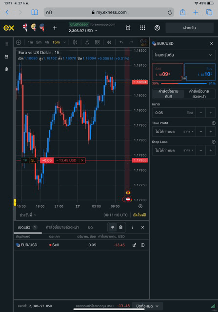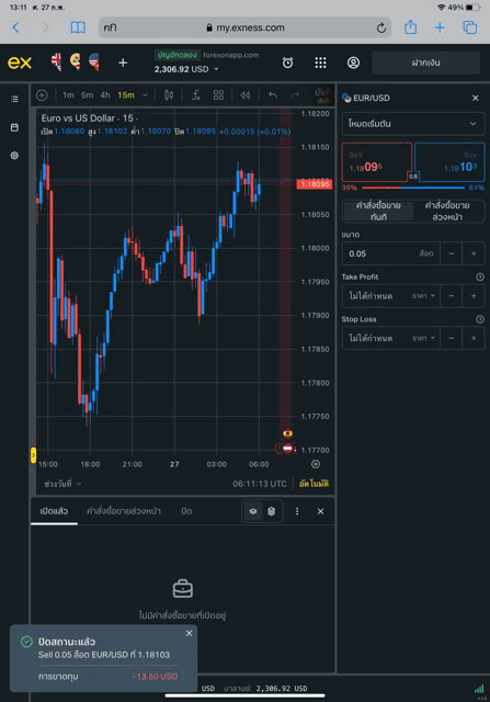 การเทรด EURUSD เริ่มแล้ว ติดลบก่อน สถานะการซื้อขายจะปรากฎบริเวณช่องด้านล่าง นักลงทุนสามารถเปิดสถานะการซื้อขายได้หลายหุ้น เช่น Forex,ทองคำ,หุ้น,เงินดิจิตอล,น้ำมัน,โลหะ (ภาพบน)